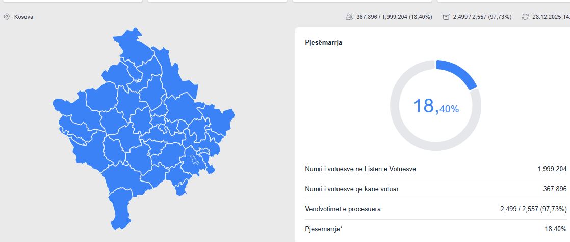 Bazuar në të dhënat e përditësuara nga Komisioni Qendror i Zgjedhjeve, pjesëmarrja e qytetarëve në përqindje është 18.40.