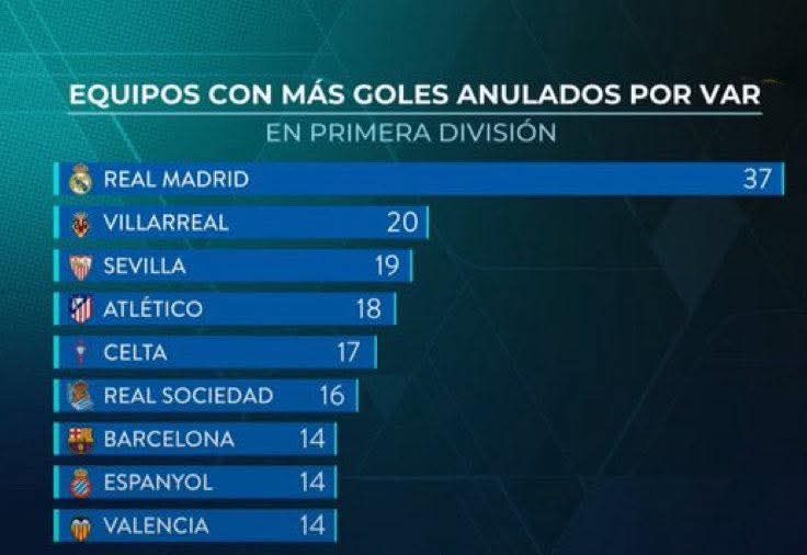 Pas “Los Blancos” renditen: Villarreal me 20 gola, Sevilla me 19 gola dhe Atlético Madridi me 18 gola të anuluar nga VAR-i. Në listë gjenden gjithashtu Celta (17), Real Sociedad (16) dhe Barcelona, Espanyol e Valencia me nga 14 gola të anuluar.