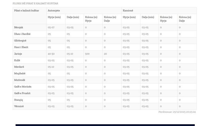 Përjashtim bën pika kufitare në Jarinjë, ku për hyrje të automjeteve raportohen pritje prej 40 deri në 50 minuta, me kolonë rreth 500 metra, ndërsa në dalje pritjet janë 5 deri në 10 minuta me kolonë rreth 20 metra. Për kamionët në këtë pikë, qarkullimi mbetet normal.