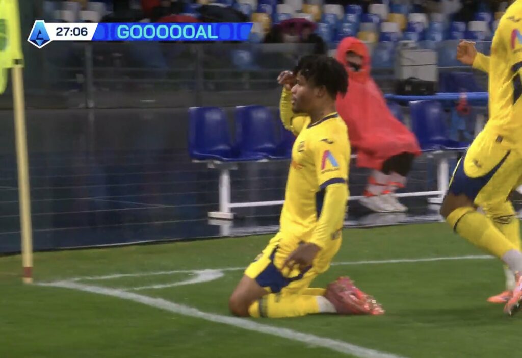 Në minutën e 16-të, Martin Frese shënoi një gol shumë të bukur me finte, pas asistit të Cheikh Niasse, pas një kundërsulmi të shpejtë. Në minutën e 24-të, Alessandro Buongiorno prek topin me dorë brenda zonës, penallti për Veronën. Gift Orban tregoht i saktë dhe dyfishon shifrat për Veronën. Pjesa e parë mbyllet 0-2.