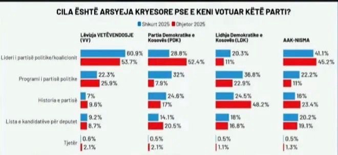 Sipas një sondazhi të publikuar sot, qytetarët janë pyetur për arsyen kryesore pse kanë votuar një parti të caktuar politike. Nga rezultatet del se liderët partiakë kanë pasur ndikim vendimtar, veçanërisht te votuesit e PDK-së dhe Lëvizjes Vetëvendosje.