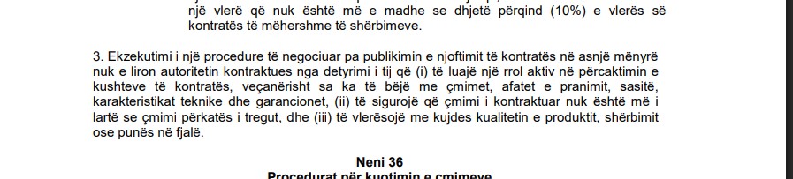 Ligji për Prokurimin Publik (LPP) është i qartë kur përcakton rregullat dhe kufizimet për përdorimin e procedurave të negociuara pa publikim të njoftimit për kontratë. Sipas nenit 35, paragrafi 2.4 të LPP-së, përdorimi i kësaj procedure është i mundur vetëm për punë shtesë që nuk kalojnë më shumë se 10% të vlerës së kontratës fillestare dhe vetëm brenda dy (2) viteve nga nënshkrimi i kontratës origjinale. Kjo procedurë mund të përdoret gjithashtu në rastet e emergjencave ekstreme, sipas nenit 35.2.1.iii, por jo për kontrata të reja dhe për vlera të konsiderueshme.