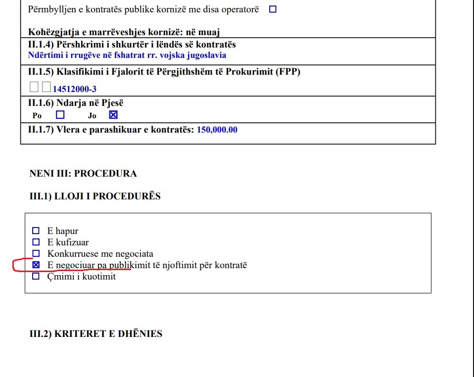 Kontrata tjetër, me titull “Ndërtimi i rrugëve në fshatrat rr. Vojska Jugosllavia”, është lidhur në vlerë prej 146,567.40 euro, pas negociatave me katër operatorë ekonomikë. Fitues është shpallur Grupi i Operatorëve Ekonomik: PLUS TRADE L.L.C.; N.T.SH. AR-DRITI; Company Murseli SH.P.K.