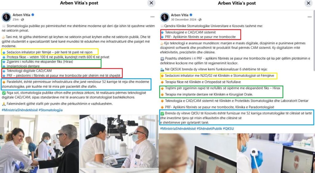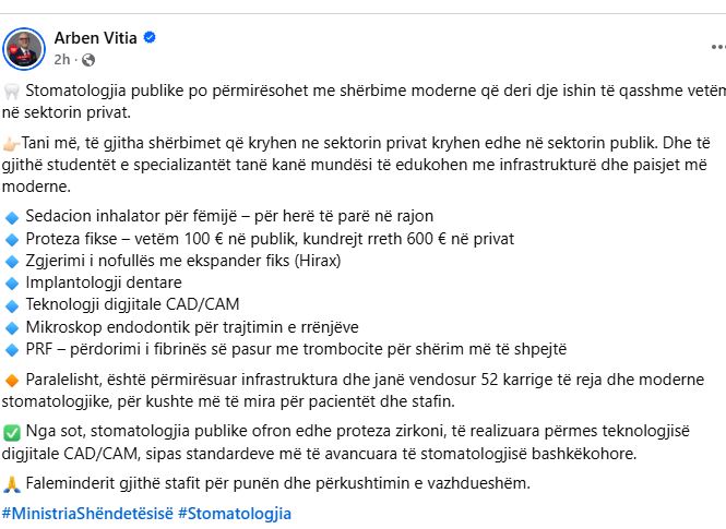 Në postimin e tij të fundit në Facebook, Vitia rendit një sërë shërbimesh që, sipas tij, po ofrohen tashmë në sektorin publik, konkretisht në Qendrën Klinike Stomatologjike.