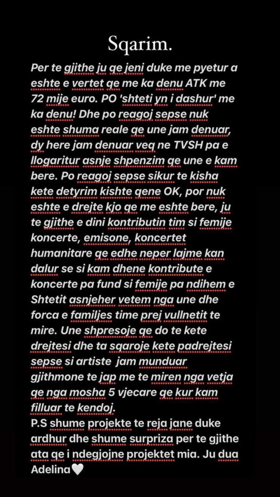 “Për të gjithë ju që me keni pyetur a është e vërtetë që me ka dënu ATK me 72 mijë euro? PO “shteti i ynë” i dashur me ka dënu”. Dhe po reagoj sepse nuk është shuma reale që unë jam dënuar”, ka shkruar Adelina në fund të reagimit të saj.