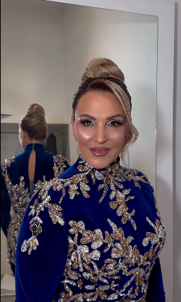 E veshur me një fustan të kaltër mbretëror të zbukuruar me detaje ari e gurë vezullues, Afërdita u shfaq më e zbukuruar se kurrë më parë.