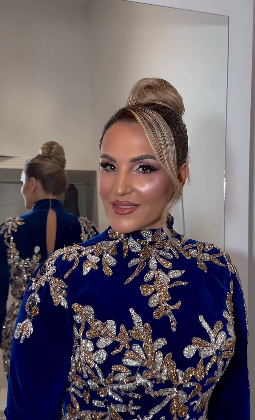 E veshur me një fustan të kaltër mbretëror të zbukuruar me detaje ari e gurë vezullues, Afërdita u shfaq më e zbukuruar se kurrë më parë.