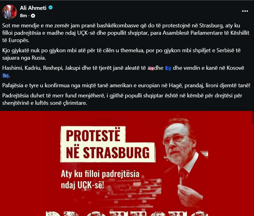 Ahmeti tha se sot mendjet dhe zemrat e shqiptarëve janë me bashkëkombasit që do të protestojnë para Asamblesë Parlamentare të Këshillit të Europës, pikërisht aty ku, siç shprehet ai, filloi “padrejtësia e madhe”.