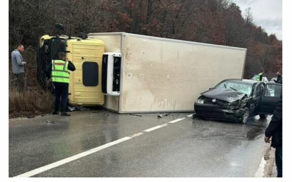 Aksident i rëndë afër Skenderajt, kamioni përfundon i rrokullisur pas përplasjes me një veturë