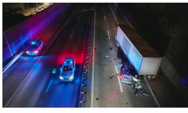 Aksidenti i parë krijoi një kolonë të gjatë trafiku, ndërsa forcat e policisë u detyruan të mbyllin një korsi për procedurat e hetimit. Pikërisht kjo situatë çoi në aksidentin e dytë tragjik, rreth orës 23:40. Një Volvo, që udhëtonte në korsinë e majtë, u përplas me shpejtësi të plotë në pjesën e pasme të një kamioni të ndalur në fund të kolonës. Përplasja e fuqishme e futi automjetin nën rimorkion e kamionit.