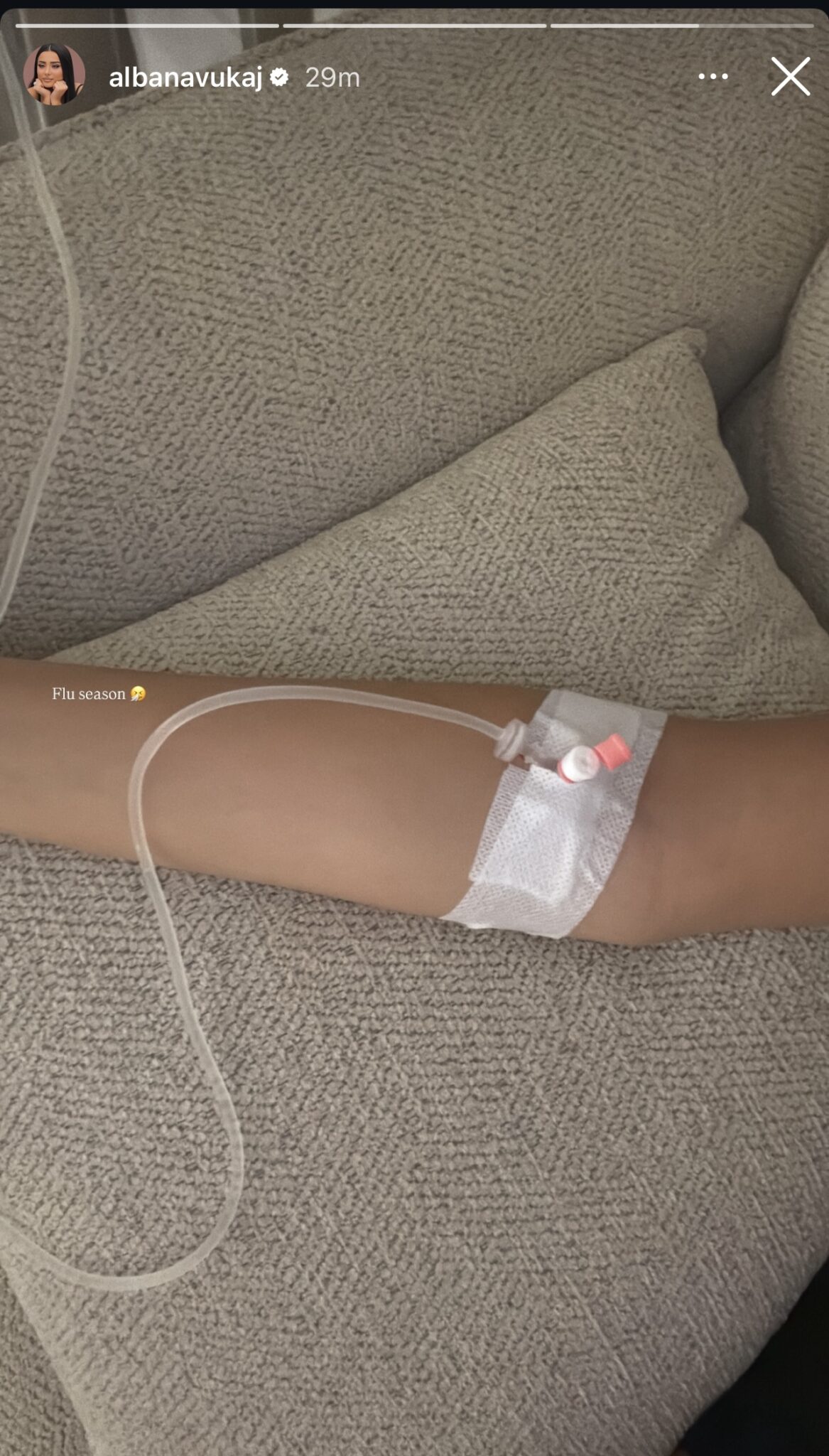 Në një Instastory të publikuar, ajo shihet e shtrirë duke marrë serum, teksa ka shkruar shkurtimisht: “Flu season”, duke treguar se është goditur nga gripi sezonal.