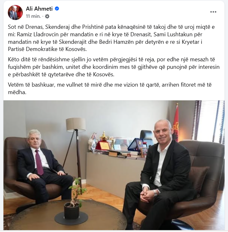 Ahmeti theksoi se këto zhvillime sjellin përgjegjësi të reja dhe një mesazh të fortë për bashkim, unitet dhe koordinim në shërbim të qytetarëve dhe Kosovës, duke shtuar se fitoret më të mëdha arrihen vetëm përmes bashkimit dhe vizionit të qartë.