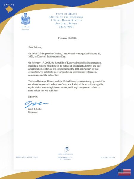 Ambasada e Kosovës në Shtetet e Bashkuara ka falënderuar Guvernatoren e Maine, Janet Mills, për njohjen zyrtare të 17 shkurtit si Dita e Pavarësisë së Kosovës në këtë shtet.