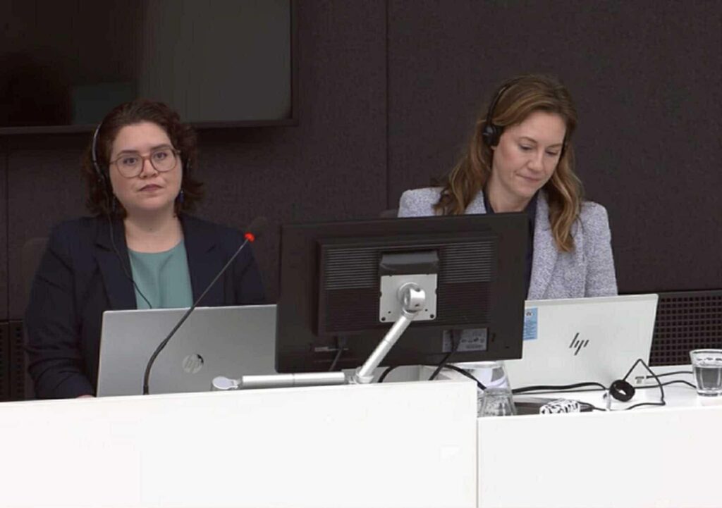 Zëvendëssekretarja e Ambasadës së Shteteve të Bashkuara të Amerikës me seli në Hagë, Terra Gearhard Serna po e përcjell nga galeria fjalën përfundimtare të Mbrojtjes së Hashim Thaçit.
