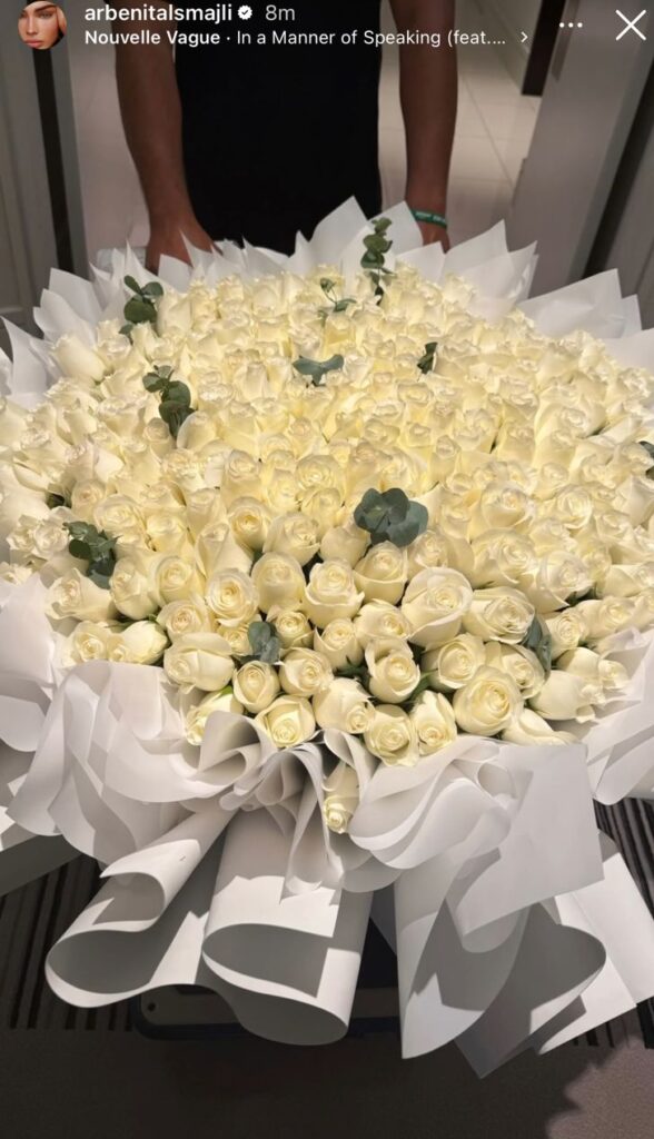 Në një postim të fundit në Instagram, ajo ka publikuar një foto ku shihet përballë një tufe gjigante trëndafilash të bardhë, një dhuratë që menjëherë tërhoqi vëmendjen e fansave.