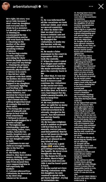 Ky është reagimi i parë i drejtpërdrejtë i Arbenitës pas ndarjes, dhe përmasat e akuzave kanë tronditur rrjetin, duke ndezur një stuhi reagimesh dhe pyetjesh për të ardhmen e kësaj sage që prej kohësh ka qenë në qendër të showbiz-it shqiptar.