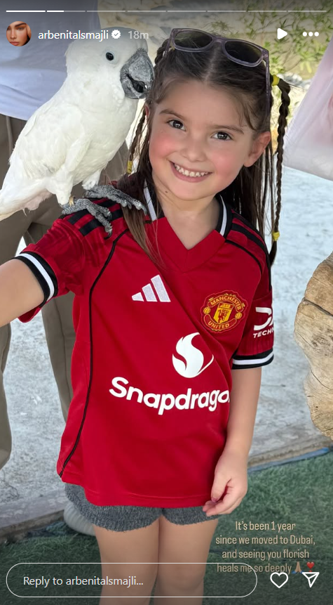 ”Janë bërë një vit prej që jemi shpërngulur në Dubai, duke të shikuar ty qe po lulëzon po shërohem thell”, ka shkruar në Instagram Arbenita.