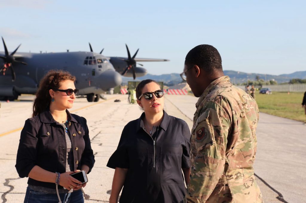 E shoqëruar nga e ngarkuara me punë në Ambasadën e SHBA në Tiranë, Leyla Moses-Ones, ministrja Xhaçka u ngjit në bordin e një prej avionëve të tipit “MC-130J Commando II”, ku u njoh me kapacitetet dhe aftësitë e këtij mjeti fluturues dhe ekuipazhit të tij.