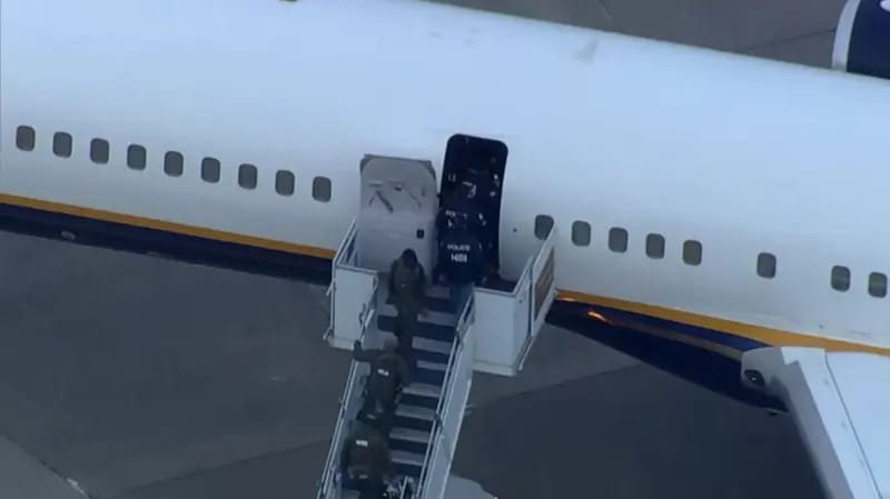 Avioni është ulur në pistë dhe një numër agjentësh të zbatimit të ligjit janë ngjitur në bord.