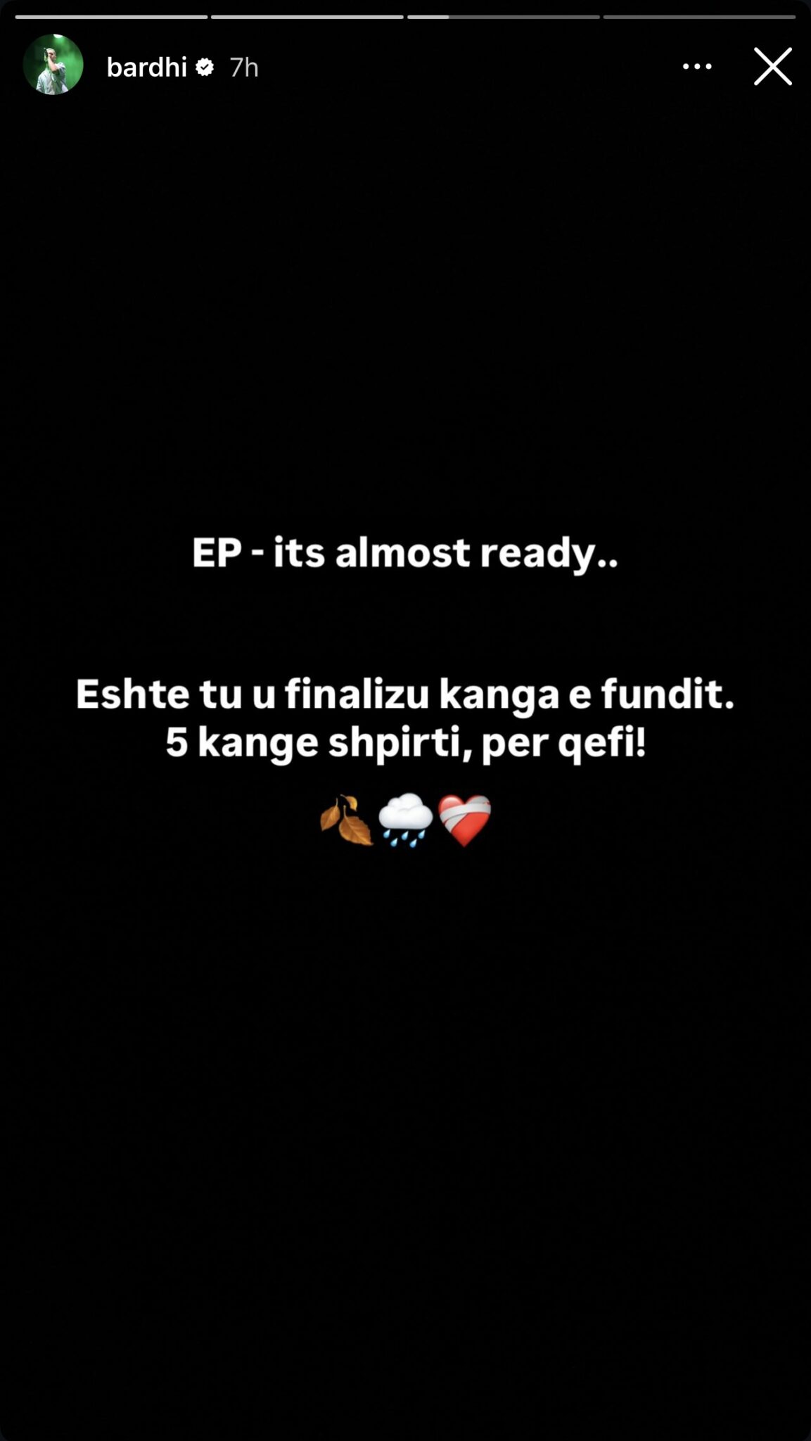 Ndërsa në postimin vijues, Bardhi zbuloi se është drejt përfundimit të një EP-je me pesë këngë, duke shtuar se janë këngë që i vijnë nga zemra: