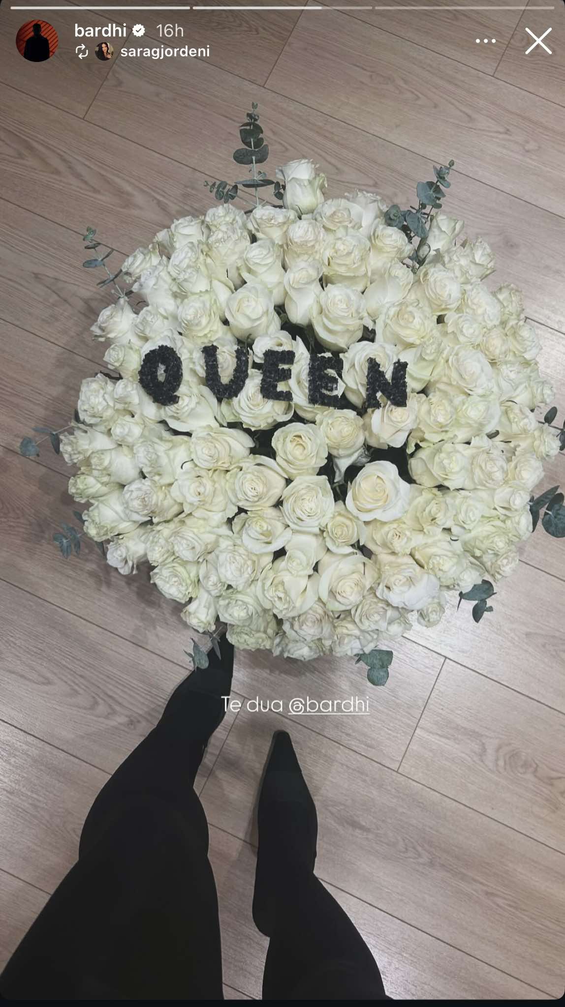Këngëtari Bardhi ka befasuar partneren e tij, Sara Gjordeni, me një buqetë trendafilash të bardhë, mbi të cilët ishte shkruar fjala “Queen”.