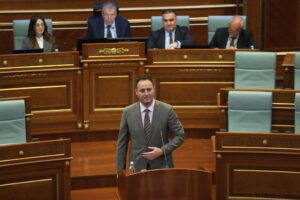 Veshja e saj spikat me një fustan/korsetë në tonalitet blu të errët, me detaje lidhëse anash që theksojnë siluetën, ndërsa sipër ka hedhur një xhakete të gjerë me vija, e vendosur mbi supe në stilin e modeleve në tapetin e kuq.