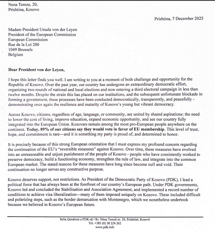 Në një letër drejtuar Presidentes së Komisionit Europian, Ursula von der Leyen, kryetari i PDK-së, Bedri Hamza, ka kërkuar heqjen e menjëhershme dhe të pakushtëzuar të masave të BE-së ndaj Kosovës, duke argumentuar se Kosova ka përmbushur çdo standard demokratik dhe ka bërë sakrifica të mëdha për integrimin europian.