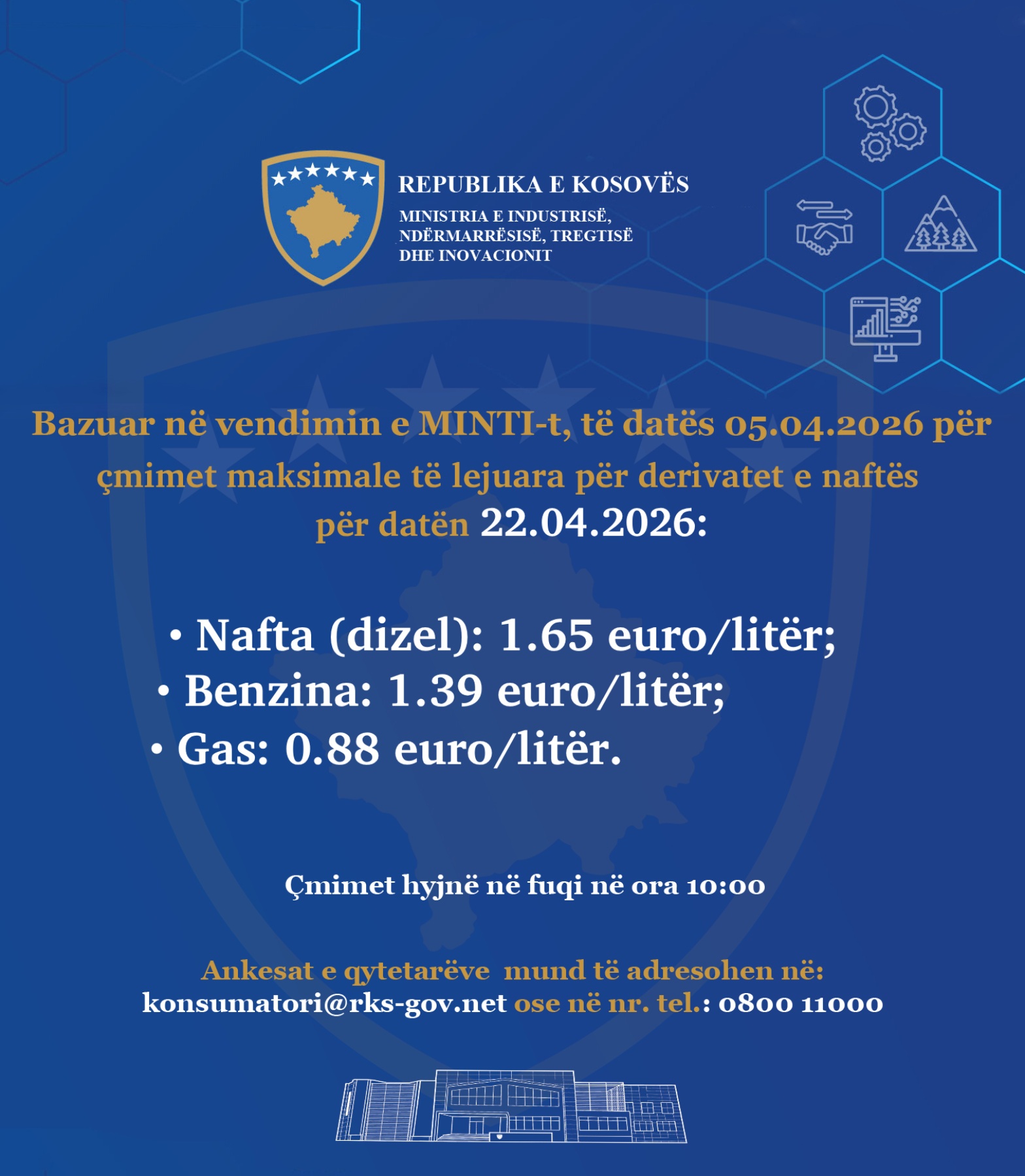 Çmimi i naftës sot është 1.65 euro për litër, i benzinës 1.39 euro për litër dhe i gazit 0.88 euro për litër.