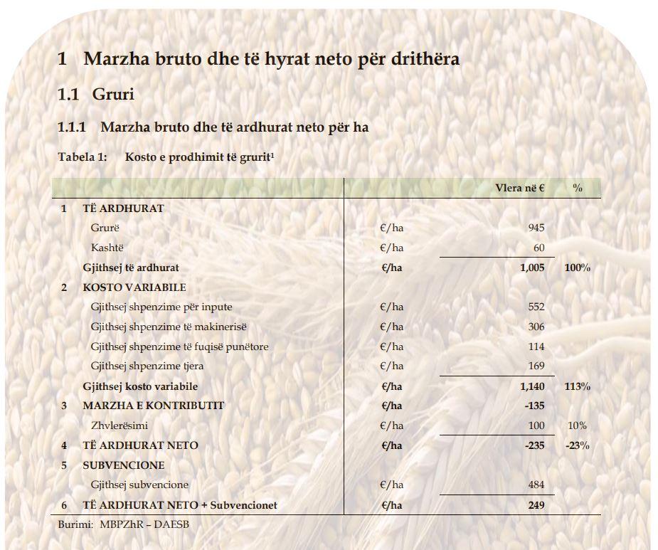 Nga të dhënat e stivuara aty, zyrtarët në këtë Ministri e pranojnë në mënyrë tacite se shteti është mjaft i gjymertë për të subvencionuar një kulturë drithi, si gruri, që është krejtësisht joprofitabile.