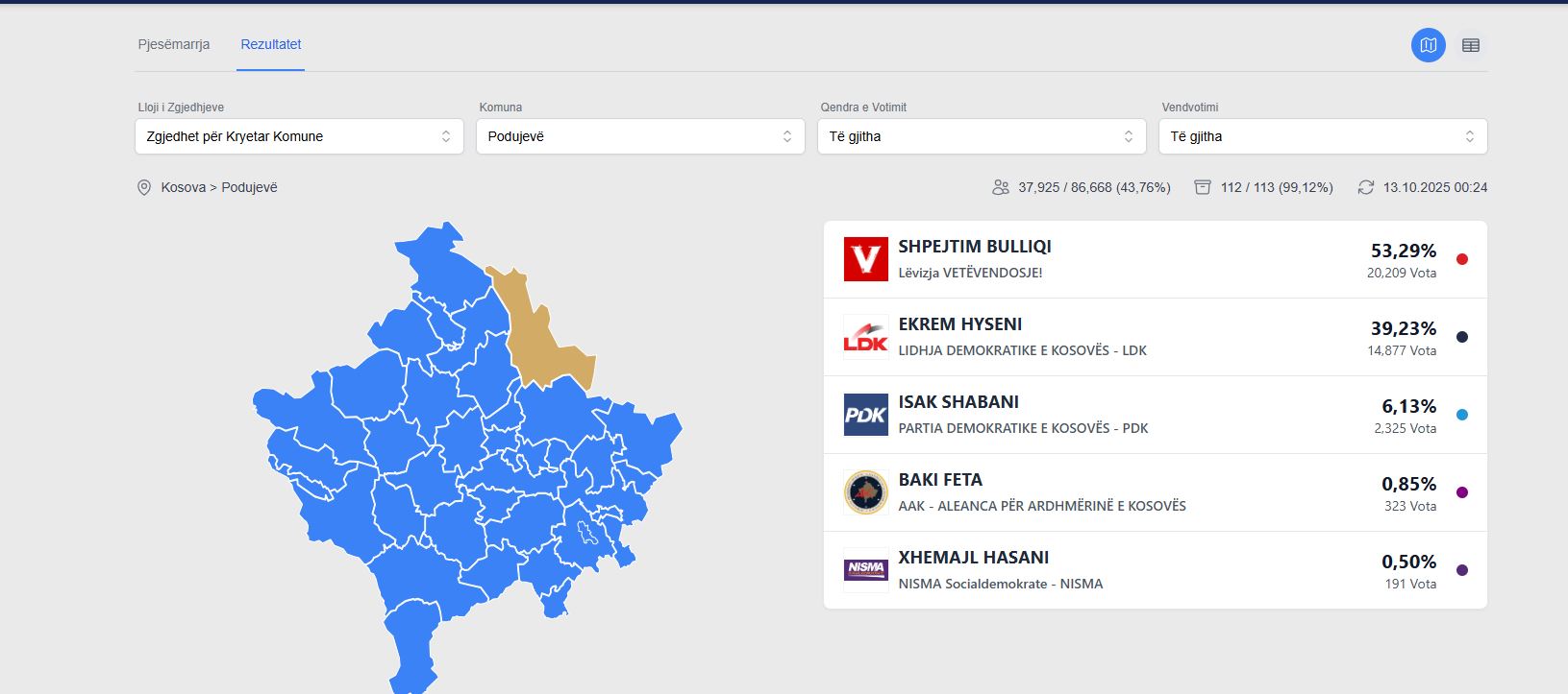 Në 99,12% të votave të numëruara Bulliqi ka marrë 53,29% të votave.