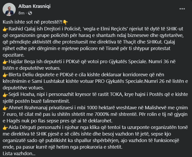 Në një postim në Facebook, Krasniqi ka renditur disa nga personat që kanë marrë pjesë në protestë, duke i shoqëruar me akuza për të kaluarën e tyre politike.