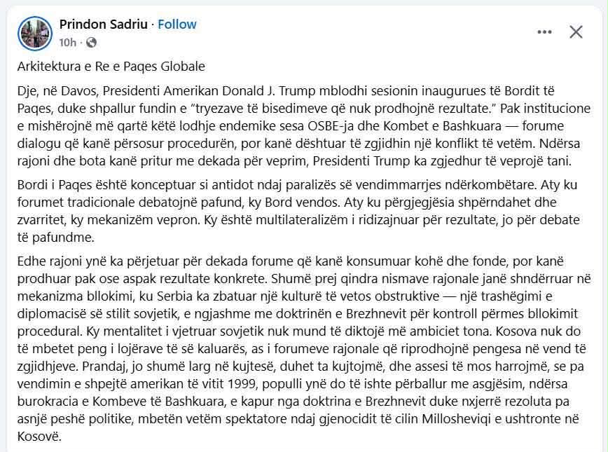 Zotëriu i parë, Prindon Sadriu një ditë pasi erdhi në përfundim se takimi i Bordit të Paqes u bë më i gjallë e më i bukur me sharmin dhe ngjyrat e bashkëshortes së tij, presidentes Vjosa Osmani, ka bërë një “analizë” të thuktë se si Organizata e Kombeve të Bashkuara e OSBE-së.