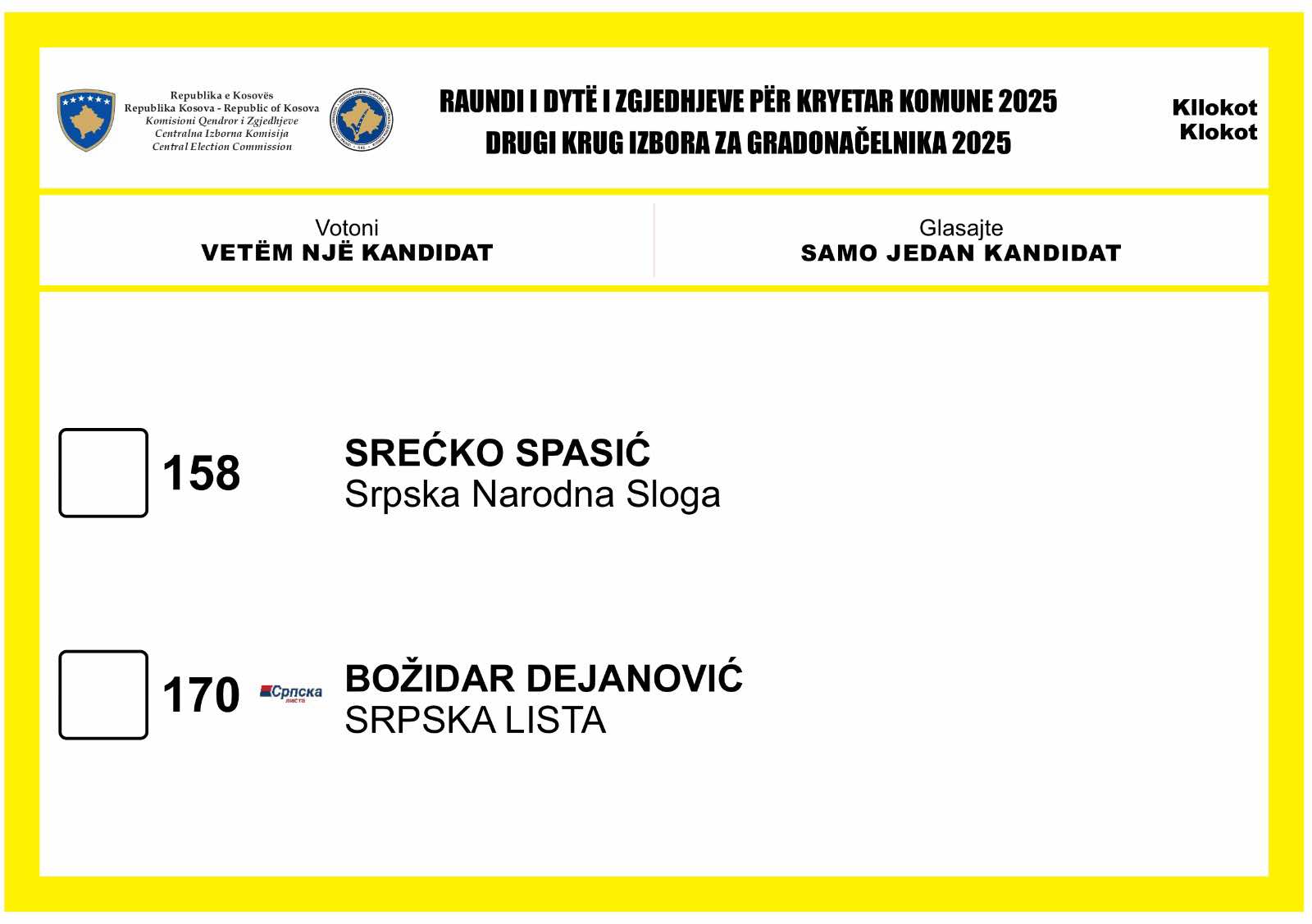 Rrethi i dytë i zgjedhjeve lokale, sipas KQZ-së, do të vazhdojë me emrat e dy kadidatëve që kanë fituar më së shumti vota në raundin e parë, përkatësisht mes Spasiçit, i cili ka braktisur “Unitetin Kombëtar Serb” për t’iu bashkuar Listës Serbe, dhe kandidatit të kësaj të fundit, Bozhidar Dejanoviç, i cili synon mandat të ri në krye të Kllokotit.