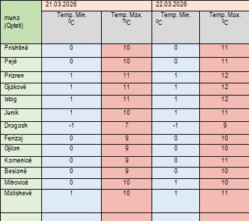 Sipas IHMK-së, të shtunën temperaturat maksimale do të arrijnë deri në 11 gradë Celzius, kurse të dielën deri në 12, transmeton Klankosova.tv.