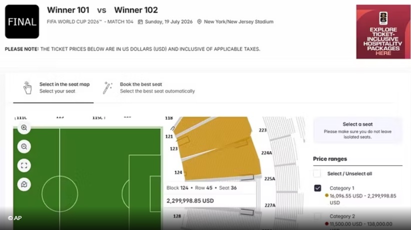 Gara për biletat e finales së Botërorit 2026, e planifikuar më 19 korrik në “MetLife Stadium” ka arritur nivele surreale. Në portalin zyrtar të rishitjes së FIFA-s janë shfaqur katër vende në unazën e parë, pas portës, me çmimin marramendës 2.299.998.85 dollarë (pak më pak se 2 milionë euro) secila, sipas AP.