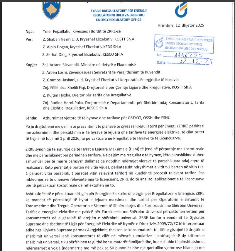 Në raportin zyrtar të datës 12 dhjetor 2025, të nënshkruar nga kryesuesi i Bordit të ZRRE-së, Ymer Fejzullahu, rregullatori u ka kërkuar operatorëve kryesorë të sektorit – KEDS (Operator i Sistemit të Shpërndarjes), KESCO (Furnizues me Shërbim Universal) dhe KOSTT (Operator i Sistemit të Transmetimit dhe Tregut) që të dorëzojnë të dhënat financiare dhe operative për vitin 2025, si bazë për përcaktimin e tarifave të reja që pritet të hyjnë në fuqi më 1 prill 2026.