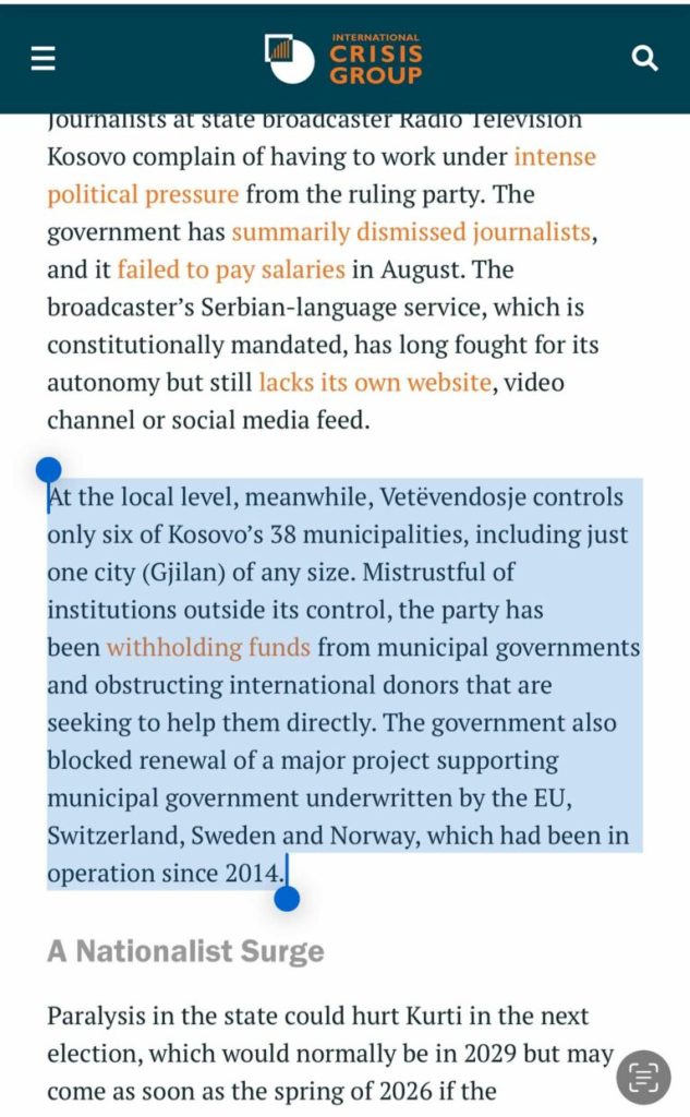 Grupi Ndërkombëtar i Krizave, një organizatë joqeveritare me seli në Bruksel në raportin e fundit, thekson se Vetëvendosje bllokon komunat që nuk i udhëheq ajo.
