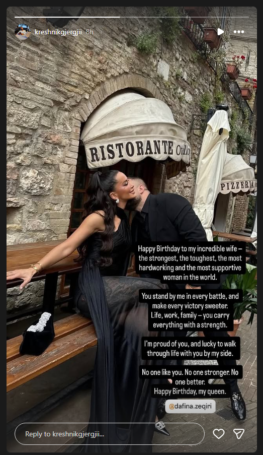 “Gëzuar ditëlindjen gruas sime të mrekullueshme gruaja më e fortë, më e ashpër, më punëtore dhe më mbështetëse në botë. Ti qëndron pranë meje në çdo betejë dhe e bën çdo fitore më të ëmbël. Jeta, puna, familja ti e mban gjithçka me forcë. Jam krenar për ty dhe me fat që eci në jetë me ty pranë meje. Askush si ti. Askush më e fortë. Askush më e mirë. Gëzuar ditëlindjen, mbretëresha ime. @dafina.zeqiri”, ka shkruar Gjergji.