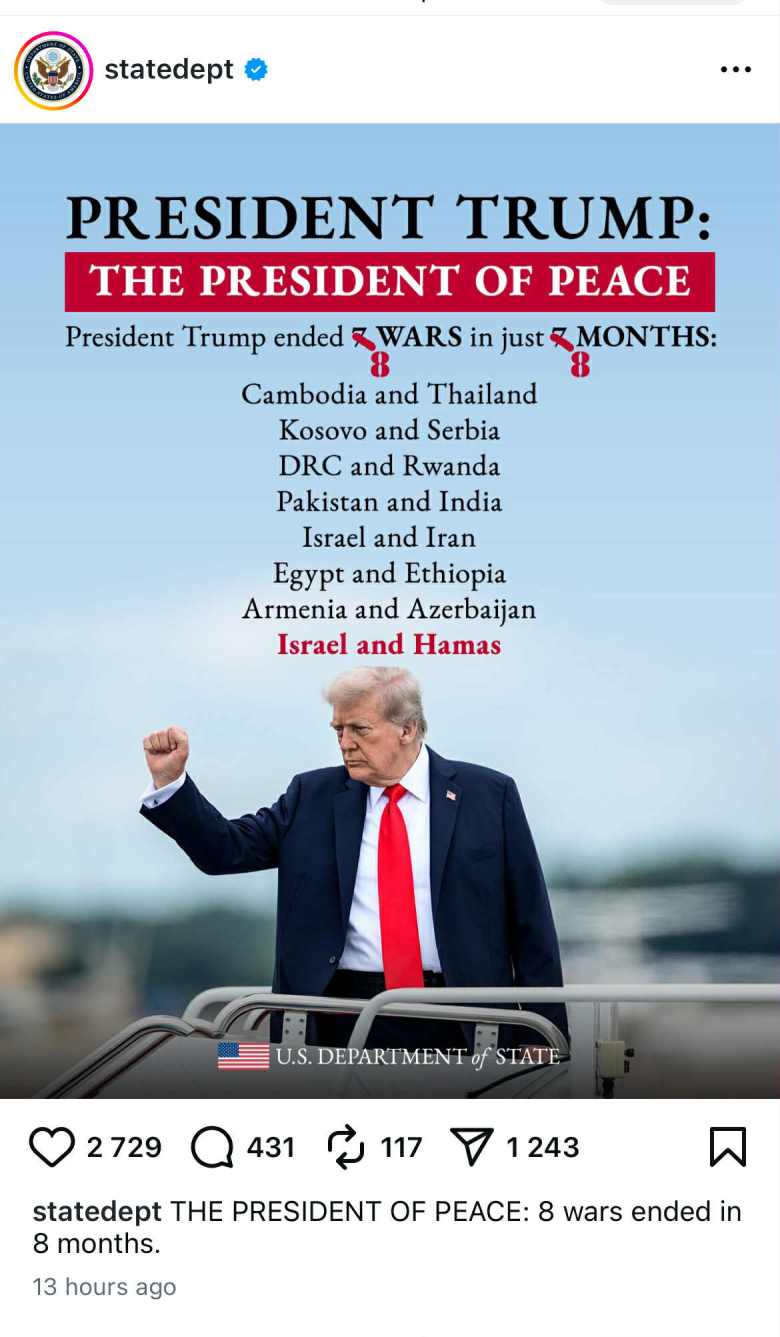 Departamenti i Shteti  edhe një herë ka dalë me një deklaratë në të cilën thuhet se ndër luftërat që ka ndalë Presidenti Amerikan , Donald Trump është edhe ajo mes Kosovës dhe Serbisë.