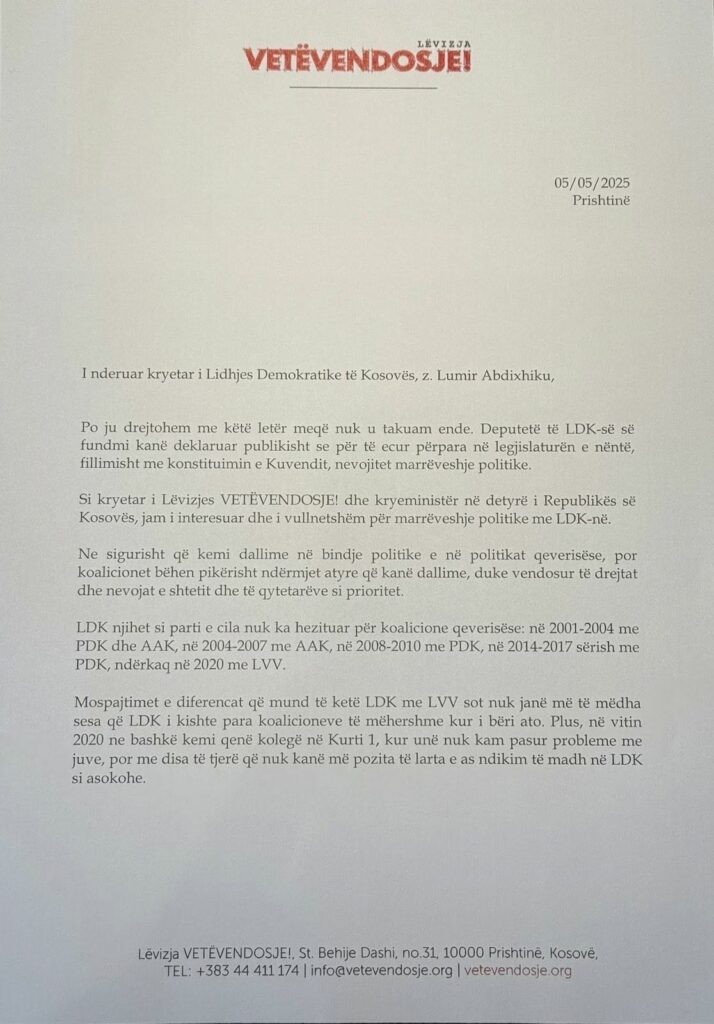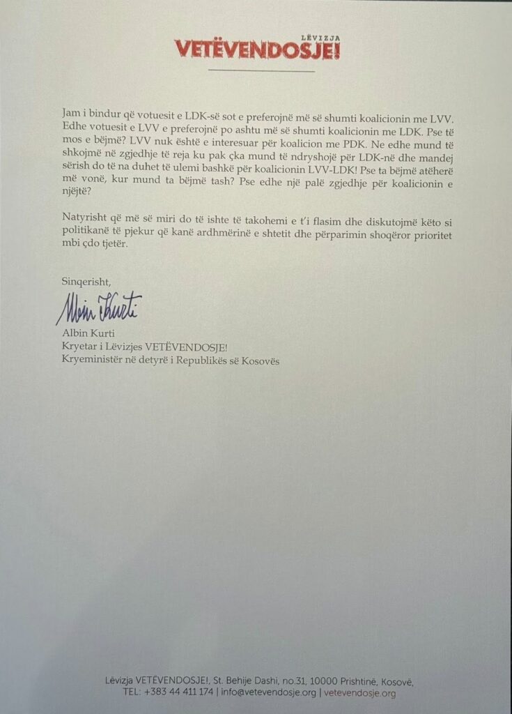 “Ne edhe mund të shkojmë në zgjedhje të reja ku pak çka mund të ndryshojë për LDK-në dhe mandej sërish do të na duhet të ulemi bashkë për koalicionin LVV-LDK! Pse ta bëjmë atëherë më vonë, kur mund ta bëjmë tash? Pse edhe një palë zgjedhje për koalicionin e njëjtë?”, thuhet në letrën e Kurtit drejtuar kreut të LDK-së, Lumir Abdixhikut.