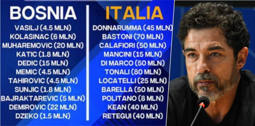 Ai theksoi diferencën mes Bosnjës dhe Italisë pas finales së “playo ff”-it në Zenica (shifrat ne foton e shkrimit), duke publikuar një grafikë. Vetëm Mancini dhe Politano vlejnë më pak se lojtari më i shtrenjtë i Bosnjës, Ermedin Demirović (22 milionë euro). “Gjeni ndryshimet”, – shkroi ai me ironi. Ndër zhgënjimet përmendet edhe Alessandro Bastoni, i dyti pas Tonalit (80 mln), me një vlerë prej 70 mln euro.