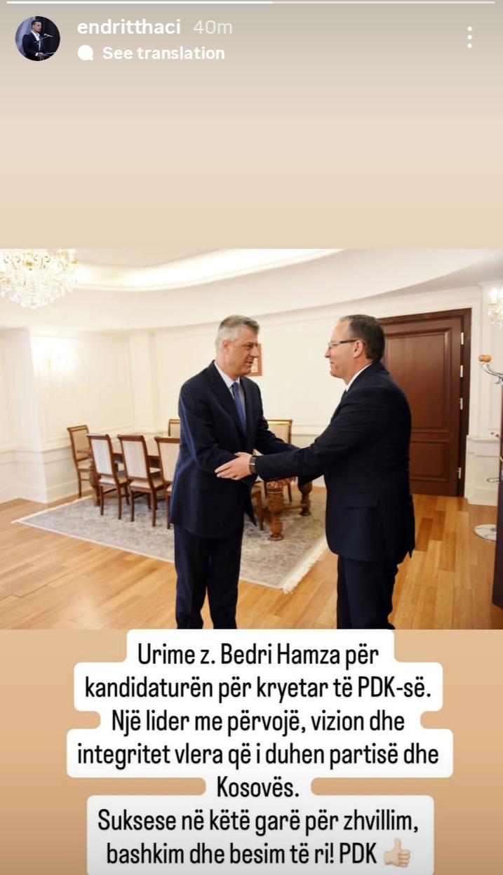Endriti, djali i Hashim Thaçit, e ka uruar për kandidimin Bedri Hamzën për kryetar të Partisë Demokratike të Kosovës.