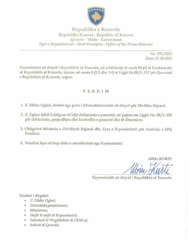 Kryeministri në detyrë, Albin Kurti i ka shkarkuar nga detyra zvministrin Elldin Ugllarin dhe këshilltarin politik Enesi Sulejmanoviç nga pozita.