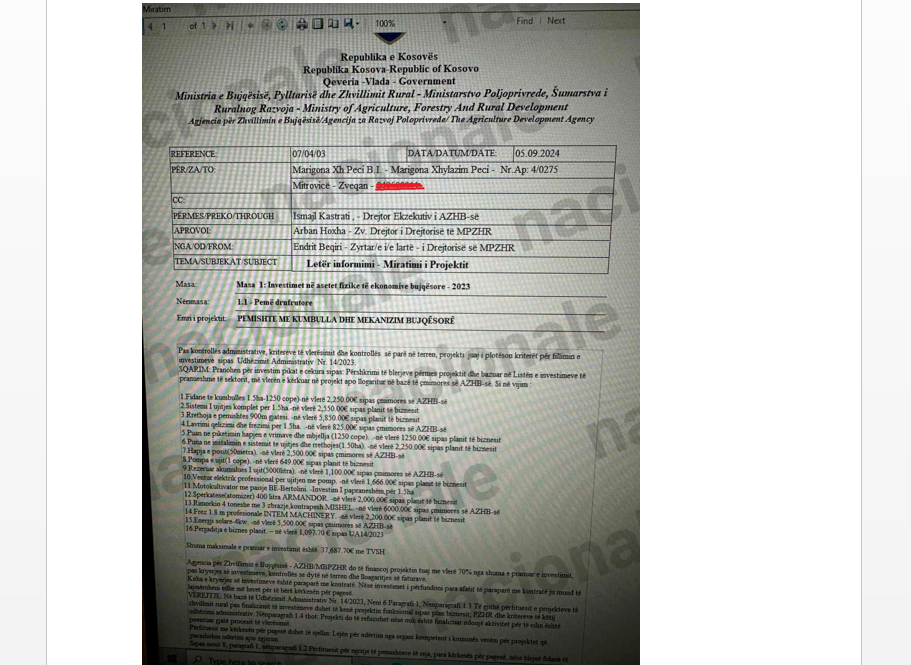 Zonja në fjalë, e cila kishte marrë grante nga Ministria e Bujqësisë, në dokumentet ku i është aprovuar ky grant, figuron edhe me emrin e babait të saj, Xhylazim Peci.