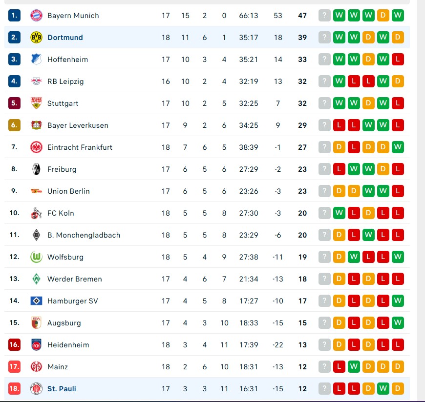 Në ndeshjet e tjera, Koln fitoi 1-0 ndaj Mainz, Wolfsburg barazoi 1-1 ndaj Heidenheim, Hamburger barazoi pa gola në shtëpi ndaj Monchengladbach. Renditja e përgjithshme deri tani është si më poshtë.