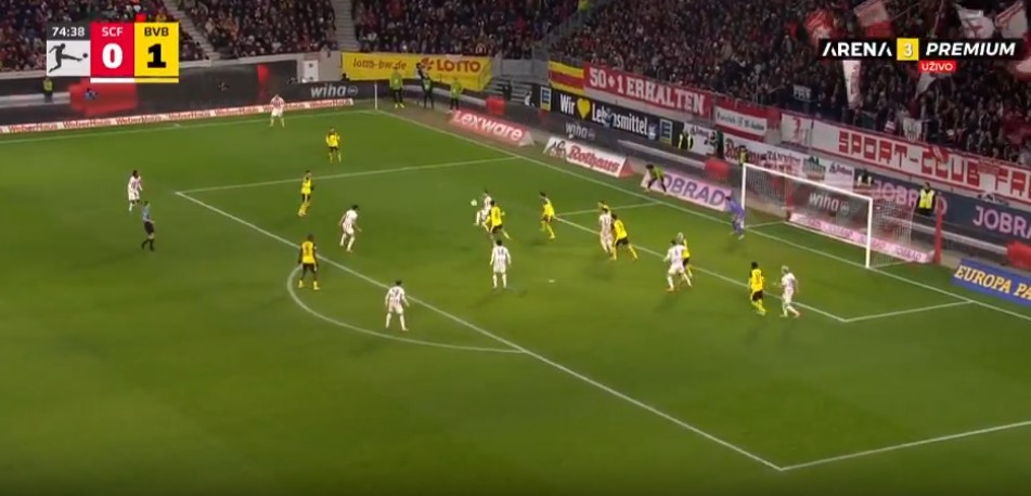 Borussia Dortmund nuk ka shkuar dot më shumë se barazimi 1-1 në transfertën ndaj Freiburg. Për verdhezinjtë shënoi mbrojtësi, Ramy Bensebaini, pas krosimit që mori nga Yan Couto nga goditja e dënimit. Pjesa e parë mbyllet 0-1 për Dortmundin.