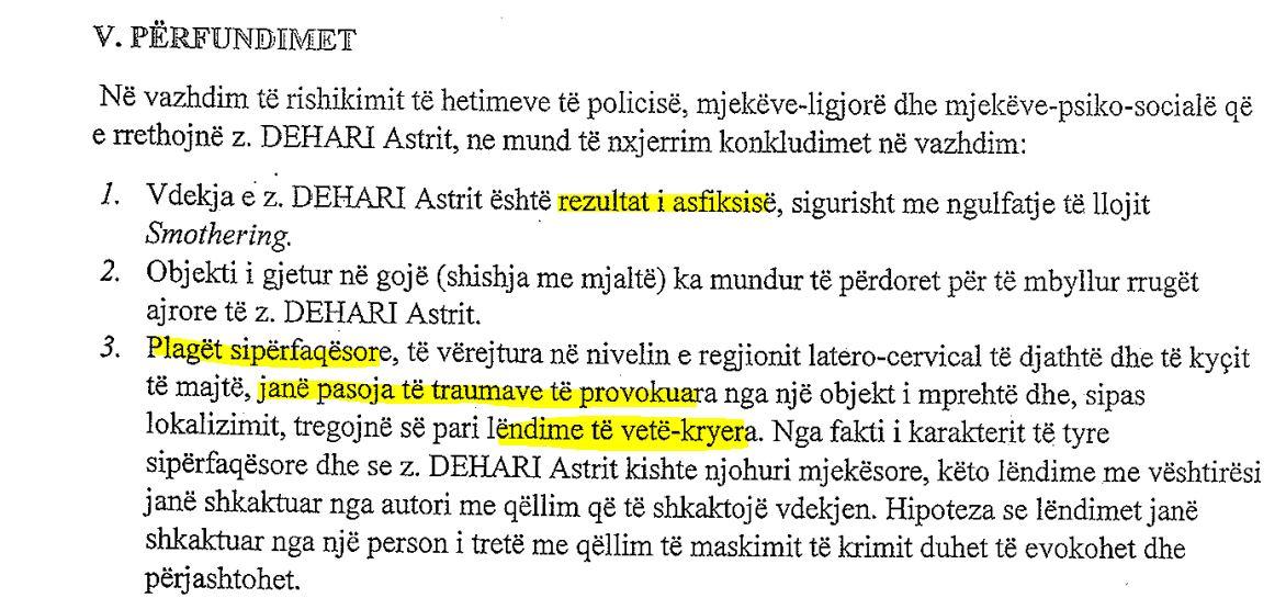Kryepërfundimi i mjekëve zviceranë ishte se “vdekja e z. Astrit Dehari është rezultat i asfiksisë, sigurisht me ngulfatje të llojit smothering”.