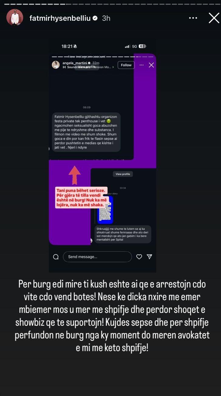 Përplasja mes modeles dhe autores Angela Martini dhe biznesmenit Fatmir Hysenbelliu ka marrë përmasa të mëdha gjatë ditës së sotme, duke u shndërruar në një nga temat më të diskutuara në rrjetet sociale dhe mediat shqiptare. Akuza të rënda janë shkëmbyer mes tyre, ndërsa palët kanë reaguar me story të njëpasnjëshme në Instagram.