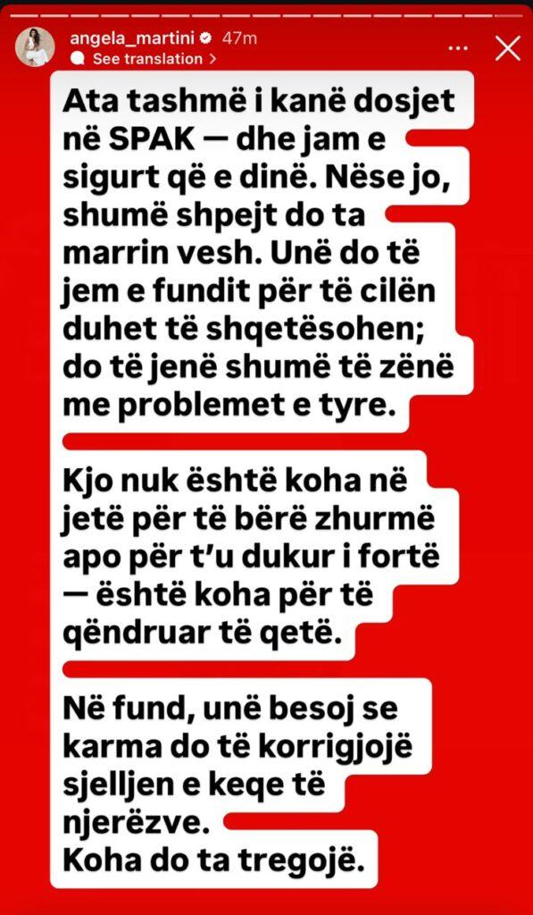 Angela Martini publikoi disa reagime ku deklaroi se tashmë “dosjet janë në SPAK” dhe se shpejt gjithçka do të zbardhet. Ajo shprehet se nuk është e vetmja që ka folur, pasi pas daljes së saj publike është përmbytur nga mesazhe të grave që pretendojnë se kanë përjetuar situata të rënda me të njëjtin individ.