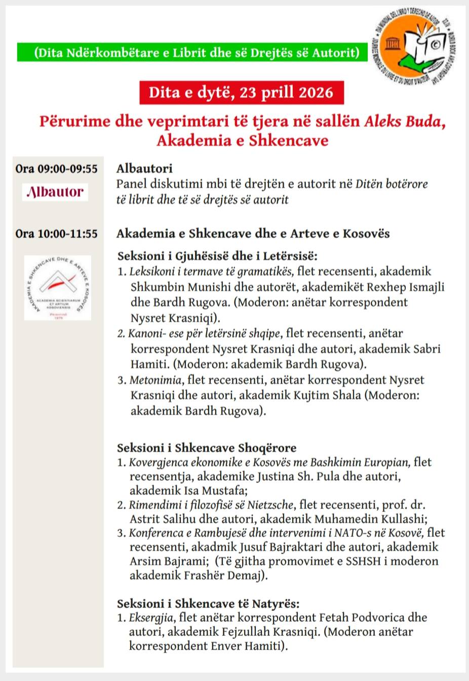 “Nesër, të enjten më 23 prill në Akademinë e Shkencave të Shqipërisë promovohet vëllimi im me poezi “Eternale” (ora 14.00) dhe libri “Leksikon i termave të gramatikës”, botim në bashkautorësi nga Akademia e Shkencave dhe e Arteve e Kosovës (ora 10.00). Që të dyja promovimet mbahen në sallën “Aleks Buda” në Akademinë e Shkencave të Shqipërisë në Tiranë, në kuadër të Panairit të librit akademik dhe shkencor, në Ditën Ndërkombëtare të librit. Pjesëmarrja e secilit veç e veç do të ishte nder i veçantë për mua dhe për librin”, shkruan ai.